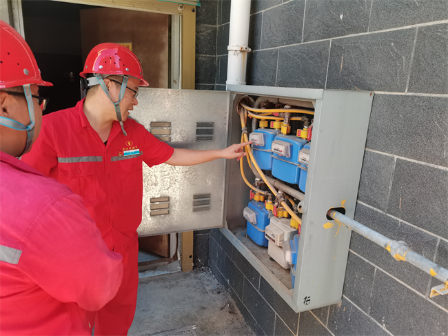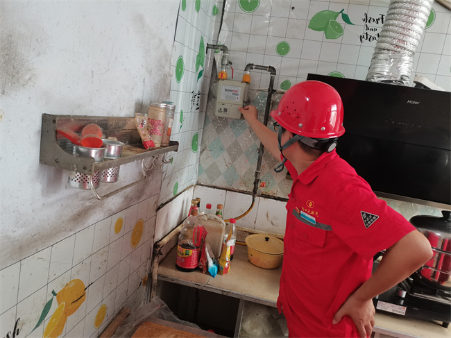在安检现场,陈柯深入用户家中询问了入户安检情况,查看了安检记录登记是否规范,并与安检人员进行了沟通,了解了安检、抄表、增值业务完成情况以及OCR抄表存在的问题,并现场查看了燃气表箱卫生清理情况。