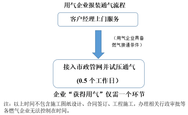 凡是燃气管网辐射区域内的用户,“获得用气”仅需1个环节:即“接入通气”,共需0.5个自然日,申请报装“零成本”。