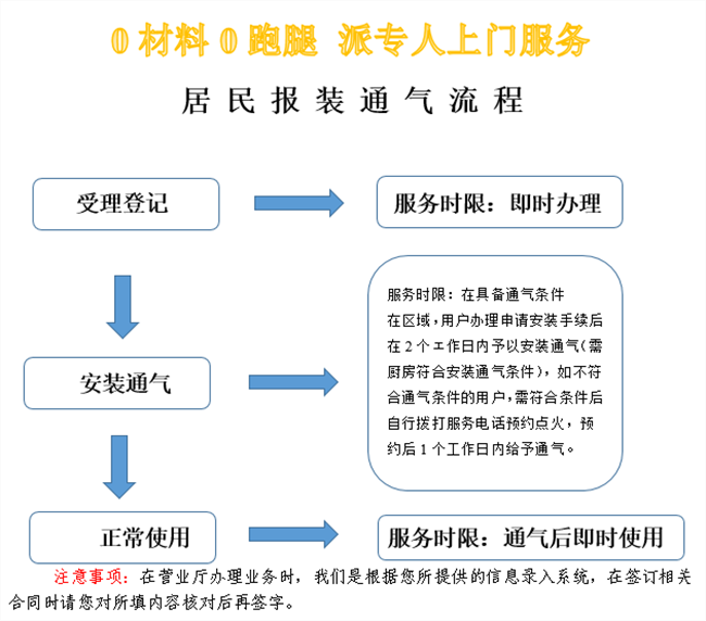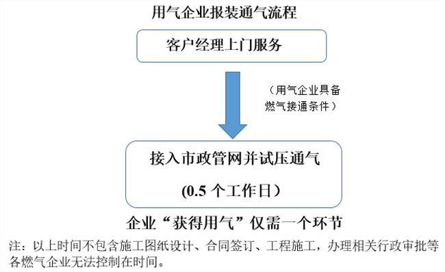 凡是燃气管网辐射区域内的用户,“获得用气”仅需1个环节:即“接入通气”,共需0.5个自然日,申请报装“零成本”。