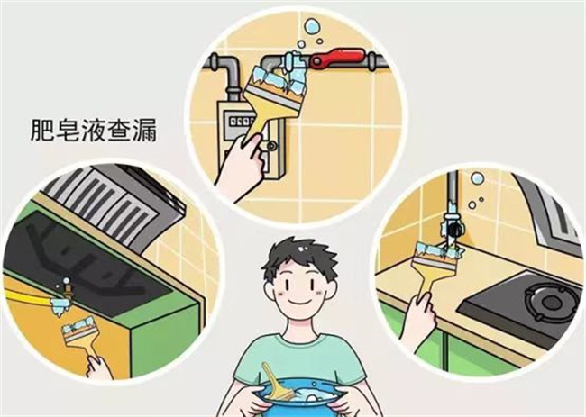 (2)查找燃气泄漏点。检查时,可用肥皂水、洗洁精等涂在可能产生漏气的地方,如管道的接头,表、灶的开关等处,若有漏气,则该处会连续冒泡。