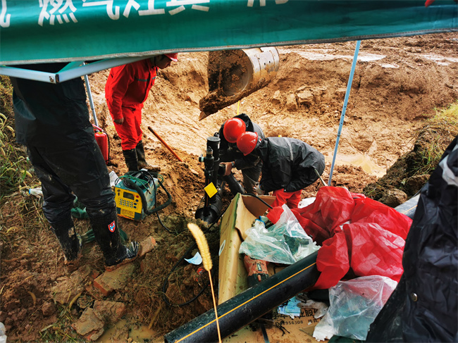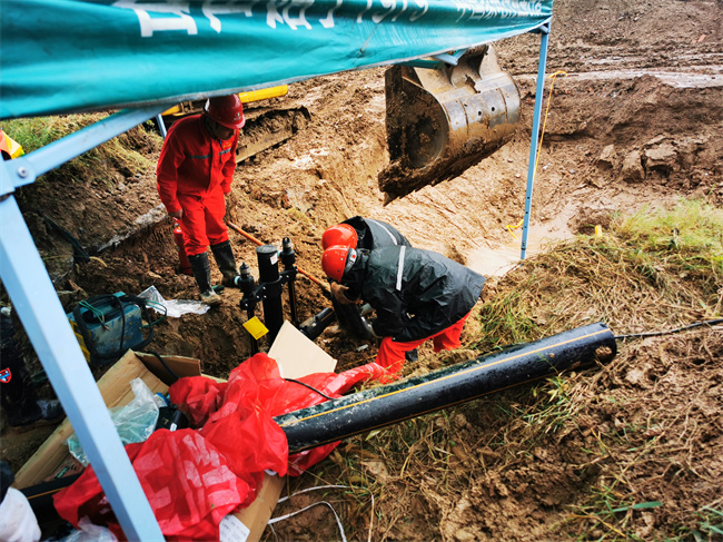 战斗打响!运营抢险人员在现场领导的带领下各司其职、协同作战。“因为作业现场邻近居民区,我们划定了安全警戒区域,拉起警戒线、封锁道路并禁止机动车辆打火等易发生明火行为。”运营部副部长刘金凯说,“即便是在白天光线视野较好的情况下,因雨水倒灌,塌方作业坑的作业环境仍给抢修作业带来一定的阻碍和安全隐患,我们的运维抢险人员克服大雨、泥泞的不利条件,小心指挥挖掘机对受损管道进行挖掘作业,在修复更换毁损管道后,进行通气置换并用测漏仪器对接头进行检漏查验。经科学、快速、有序的协同配合,整个抢险过程历时2个小时,天然气泄漏管道抢修完毕,恢复正常供气,现场险情解除。”