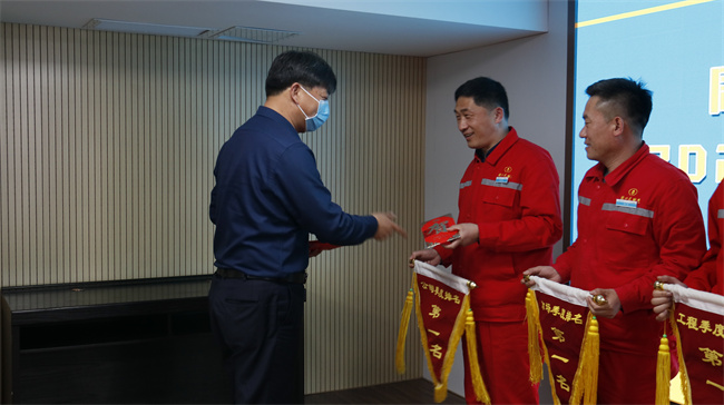 会上进行了红黄旗交接仪式,董事长赵广良为获得红旗单位颁发奖金