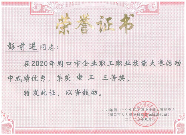 彭前进于2010年入职周口市天然气有限公司,十三年来一直在加气母站担任电工职位,他在平凡的岗位的上辛勤劳作,默默奉献,取得累累硕果,先后获得了“河南省技术能手”荣誉称号、“周口市企业职工职业技能大赛三等奖”等荣誉。
