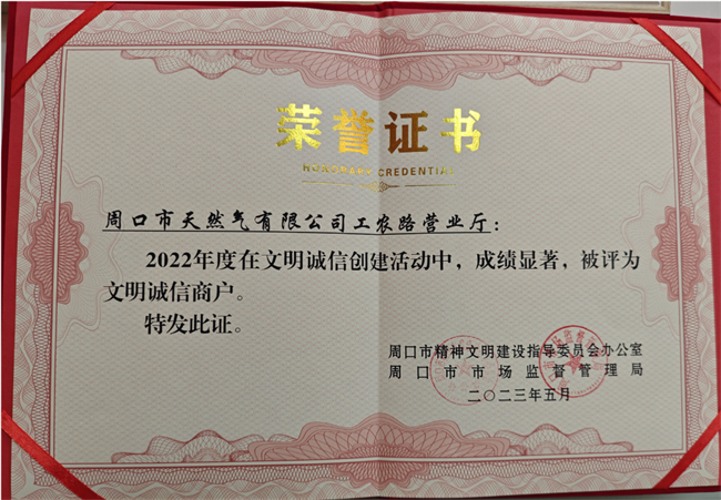 为深入培育和践行社会主义核心价值观,大力营造健康和谐、文明诚信的社会环境,强化社会公众和市场主体做文明人、办文明事的思想认知,优化营商环境,助力“信用周口 ”建设,周口市文明办、周口市市场监管局今年在周口市开展了2022年度文明诚信市场、文明诚信商户评选活动。经评选,周口市天然气有限公司工农路营业厅荣获“2022年度周口市文明诚信商户”。