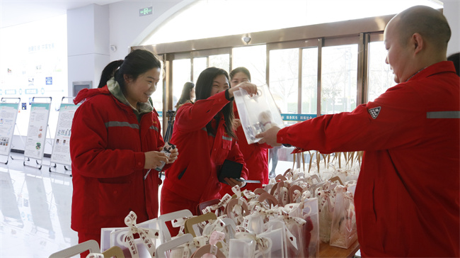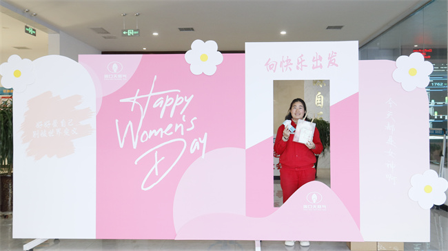 上午8点10分,女神们齐聚公司一楼大厅内,行政管理中心经理李强代表公司经营班子向女神们送上温馨精致的礼品,并引导大家在“向快乐出发”打卡墙拍照留念,为节日带来满满的仪式感。
